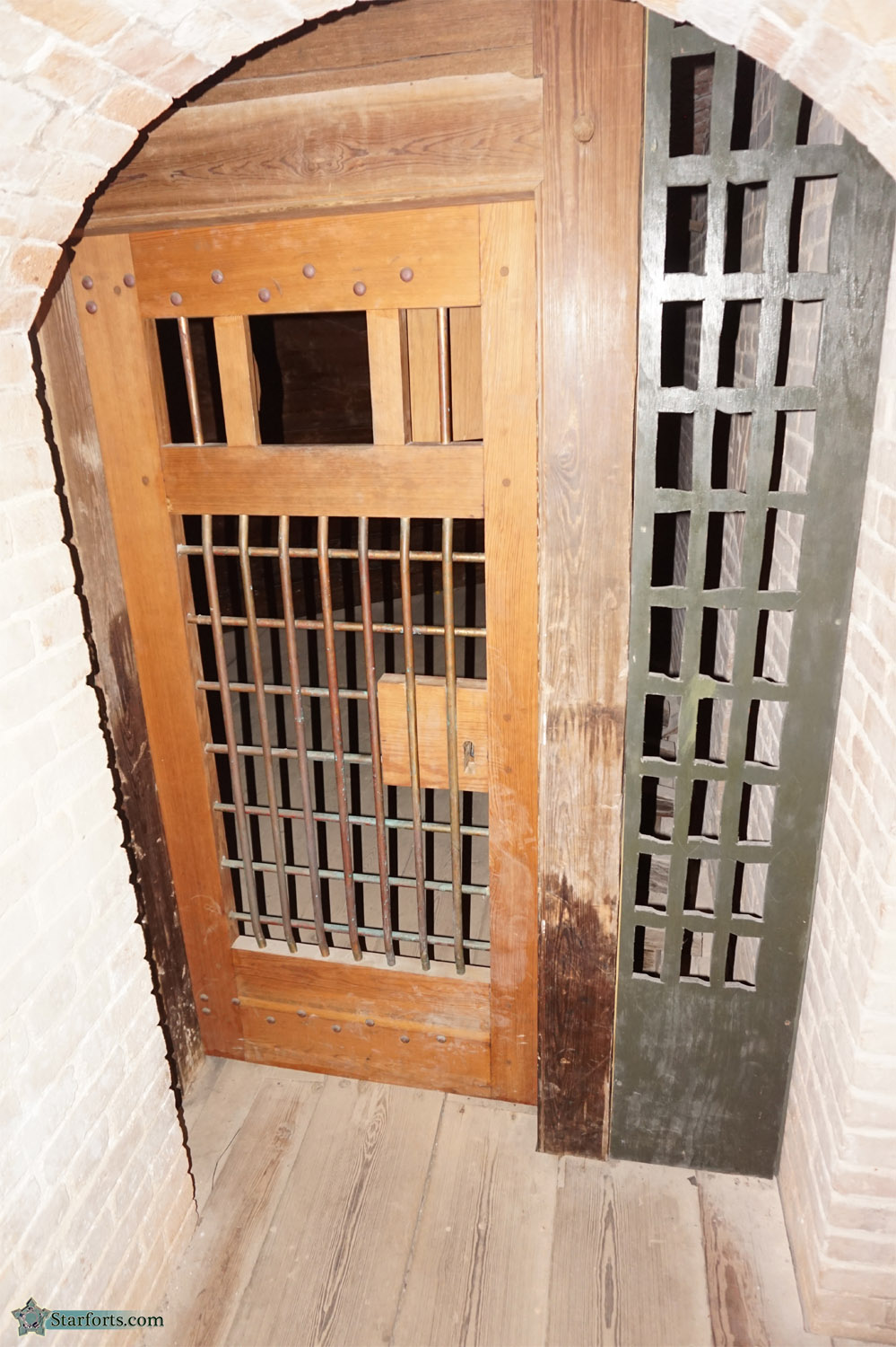 There's also no heavy oak door protecting this magazine. There is a locked door, but a troublemaker could just toss a match through the grate on this door...could it have been that this magazine, in the counterscarp, wasn't thought to be as vulnerable to enemy action? The only way into the counterscarp is through the fort itself, and the tunnel that leads to the counterscarp isn't visible from outside the fort. I guess if an enemy had gotten into the counterscarp, the fort was already lost, so why bother hanging an expensive oak 'n' stud door on this magazine?