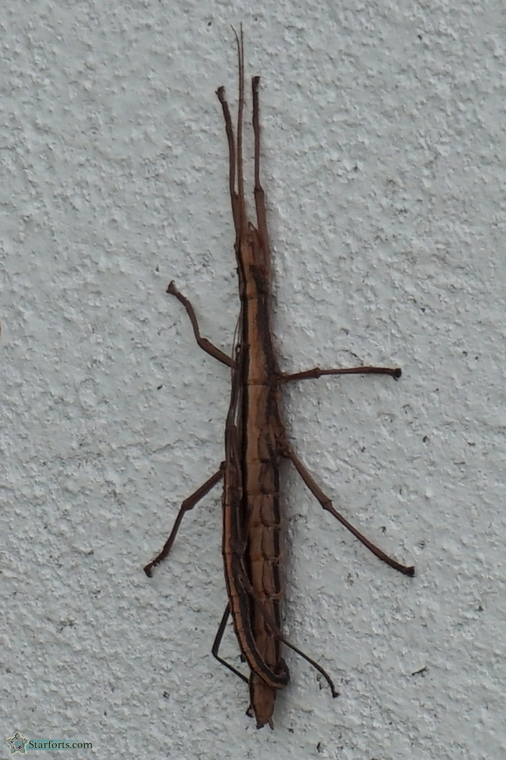 More starfort wildlife: Anisomorpha buprestoides, or the twostriped walking stick! Since groovy insects can't just have one name, these guys are also known as devil's riding horse, prairie alligator, stick bug, witch's horse, devil's darning needle, scorpion, and musk mare. I know better than to poke at weird bugs with which I am not familiar, which turns out to be have been wise, because this insect's defensive mechanism is emitting a strong-smelling spray, which is irritating to the eyes and mucous membranes.