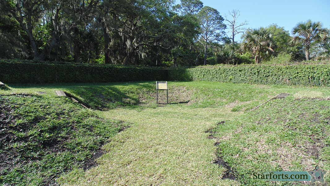 The inside of that southern bastion. The sign says, This exhibit symbolizes the French Colonists' quest for religious freedom and a desire to improve their lives. Honor their memory by not climbing on the walls or cannons. I honored their memory by not climbing on the cannon and only climbing onto that one starfort corner, because it was important to do so. The ghosts of the Spanish-slaughtered French settlers sighed in the trees that they approved.