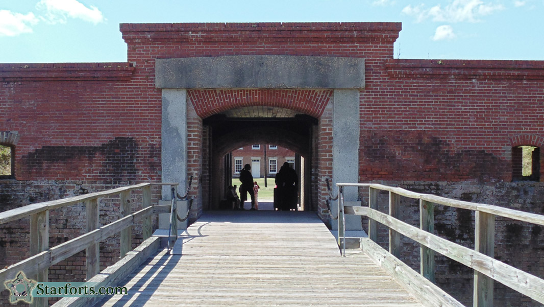 The main gate of Fort Clinch! Originally one crossed the glacis and entered the fort over a Swing Bridge, which pivoted at its center. Perhaps this was intended to twirl at a high rate of speed with attackers on it, causing them to get dizzy, vomit, and then be too embarassed to continue the attack. This twirly bridge concept was also employed at fellow Polygonal Fort Fort Montgomery, at Rouses Point, New York.