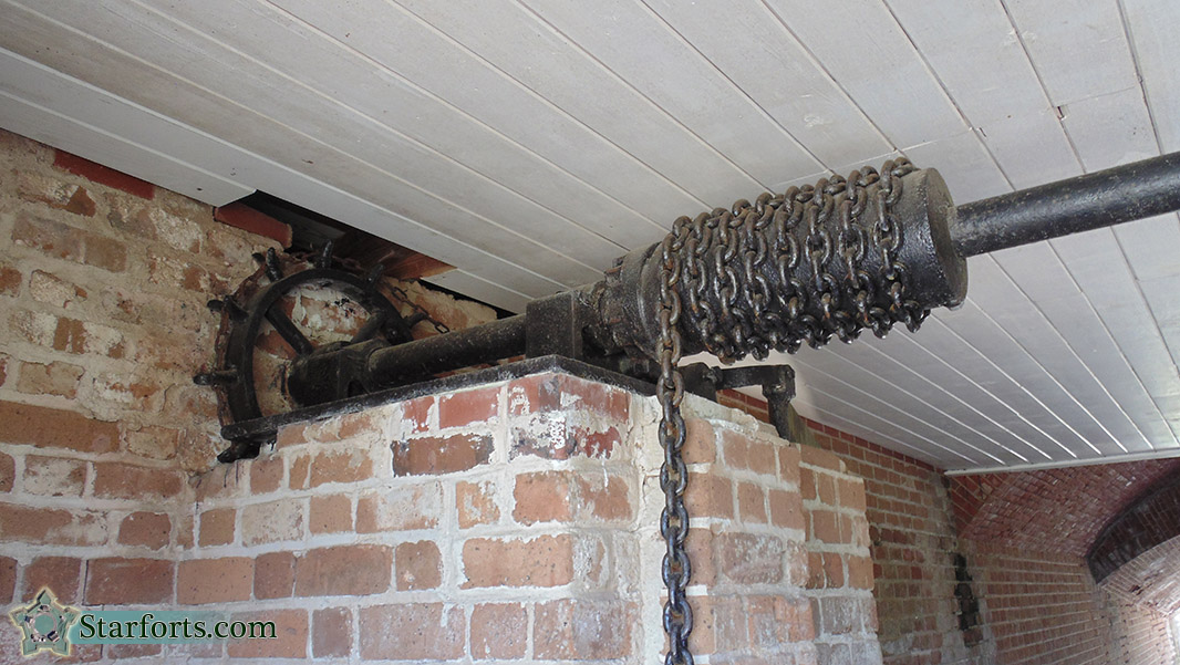 Machinery exists just inside the main gate to raise the walkway up, so as to essentially close the front door. One imagines that