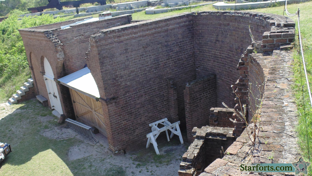 A lumber shed, in the fort's northwest corner. Protected by the white sawhorses is an Officer's Latrine, the user of which would enjoy a great deal more privacy than the enlisted men!