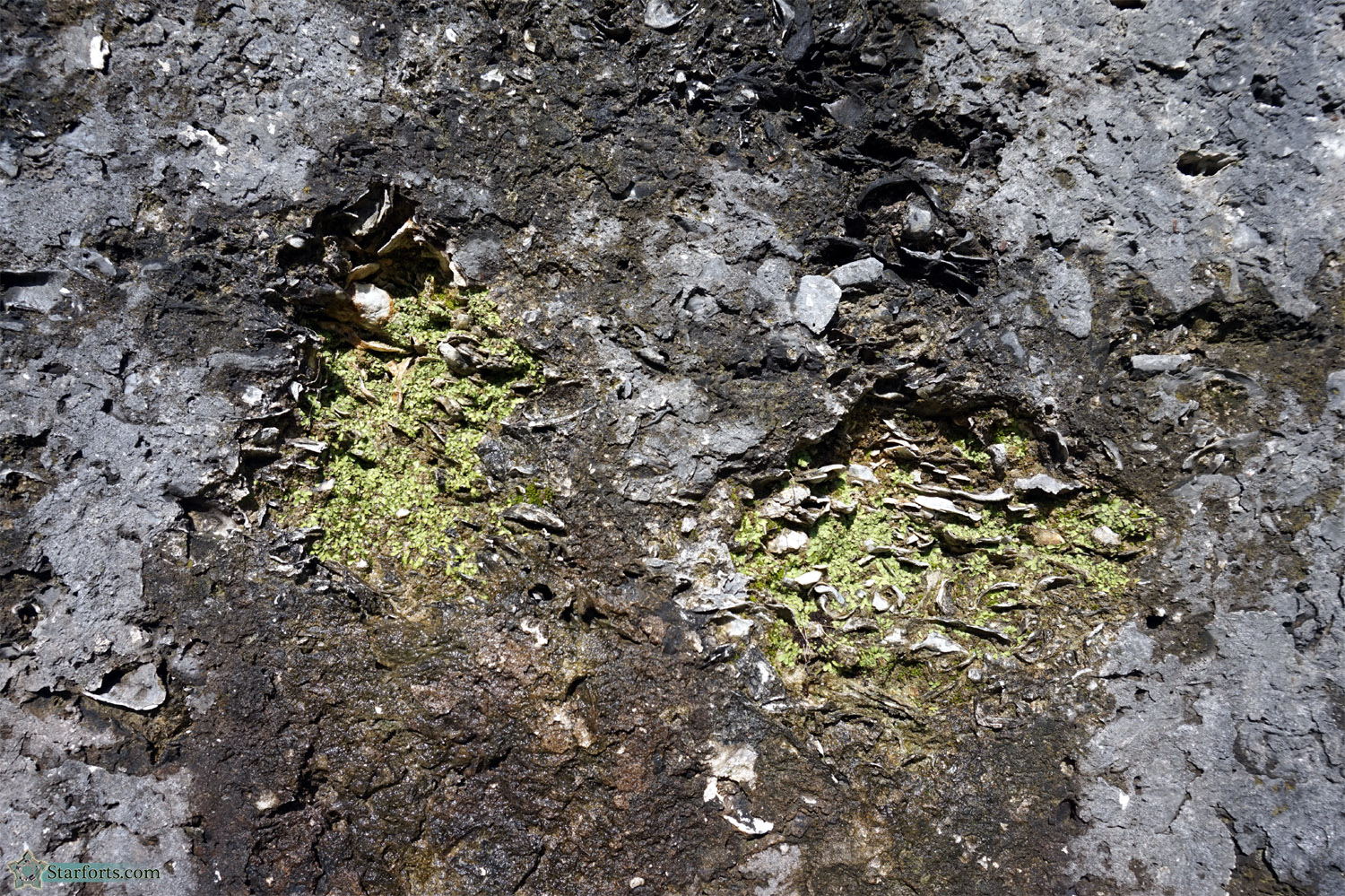 A better look at a tabby wall! Tabby was made mostly (and obviously) of shells, an easy enough building material to come across along the Ashley River at the time. A layer of stucco made the walls less poky and scrapy for those rubbing against it on a regular basis, but most of that stucco is long gone.