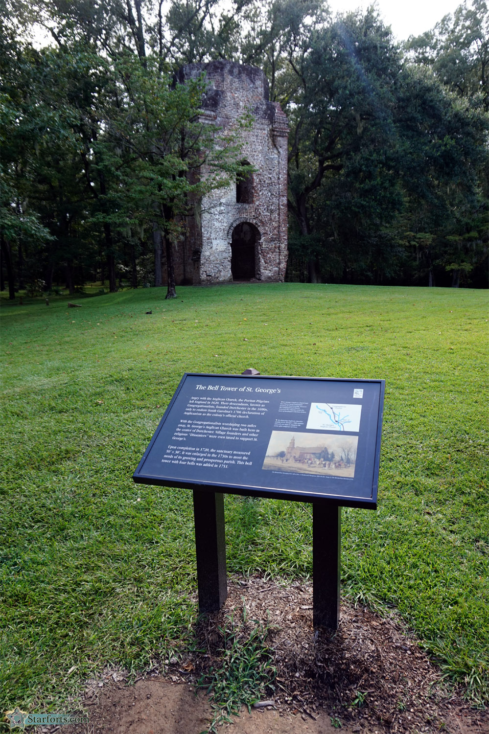 The folks who founded Dorchester in the 1690's did so, at least in part, so as to be able to worship without the grasping tentacles of the Anglican Church sucking them dry. The colony of South Carolina officially made Anglicanism its only accepted church in 1706, however, and St. George's Anglican Church was built in Dorchester in the 1720's. Its bell tower, which survives as Colonial Dorchester's most photogenic entity, was built in 1751. The sign is The Bell Tower of St. George's.