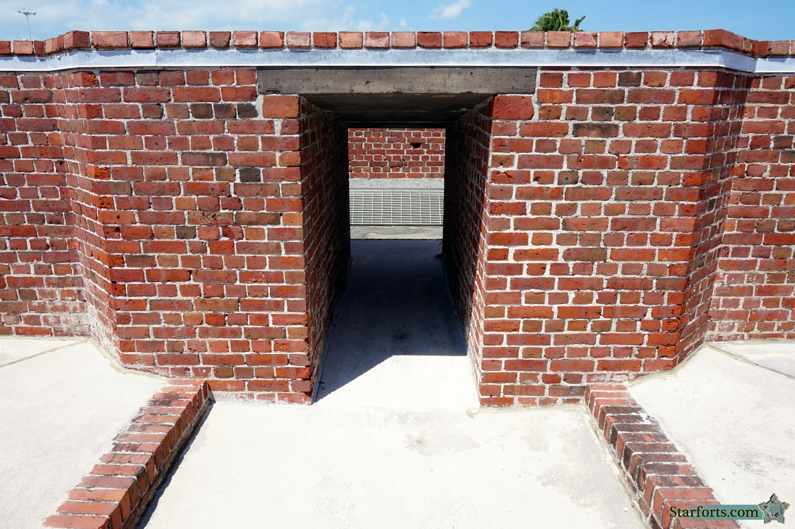 On all four sides at the top of the citadel, there are these small crawlyholes. Spotting positions for officers? Those officers must have been short of stature, as an impressive amount of stooping and scuttling was required to get into this space, which is maybe large enough for two persons to stand side by side. They're open at the top and the front side of the bottom, with only a grate, seemingly of a more modern design than 1862, preventing one's shoe from dropping 36 feet to the ground.