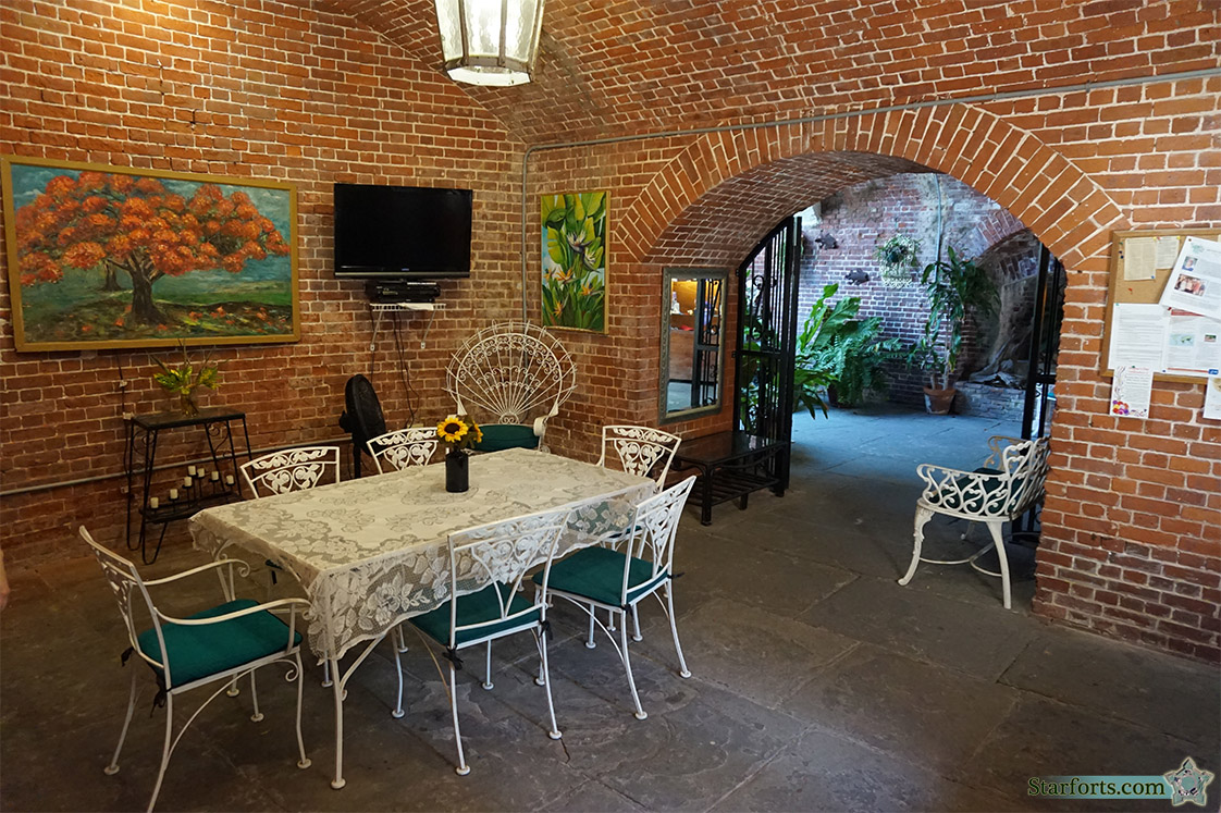 The Key West Garden Club has been in West Martello Tower since 1955. What didn't strike me at the time, as I was zooming through trying to get pictures and not really absorbing anything mentally, was how odd this looks...I've been in dozens of similar surroundings, with the bricks, arches and stone floors, but never with furniture that could be charitably described as hoidy-toidy.