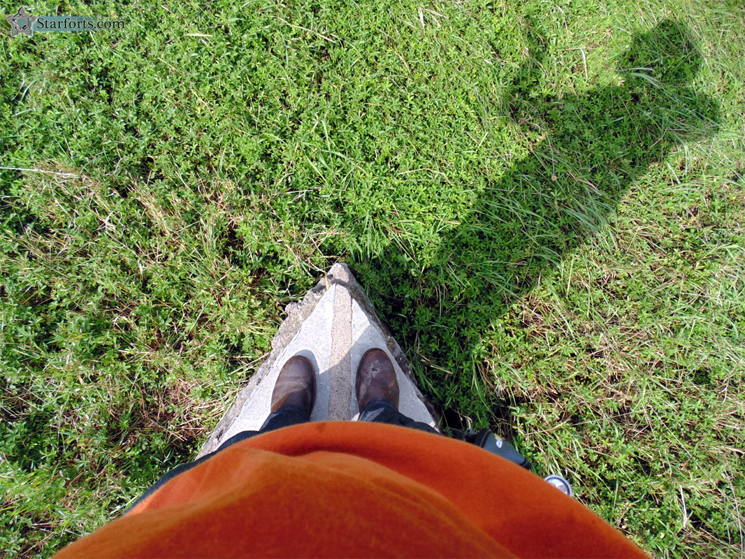 I always strive to get such a picture while at a starfort: Standing at the edge of a bastion, looking down. Sometimes this process is quite exciting (and stupid), forty feet up in the air with the wind blasting at me, and sometimes...this happens. Of course Fort Erie's bastions would have been more than 18 inches off the ground during the War of 1812, otherwise they would have been not bastions, but curbs.