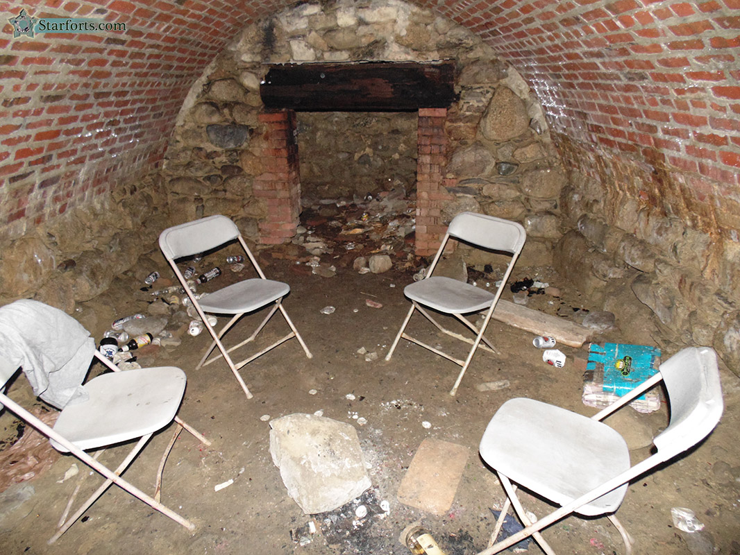 And, finally, we see what is at the end of the rainbow. The room in which powder might be kept is instead the home of four folding chairs, a notable pile of beer-related detritus, and somebody's grey Nike shirt. I hadn't put the words local and youths together in my mind until I beheld this outrage. An historic starfort, used as a secret hangout spot for beer-swilling punk teenagers?