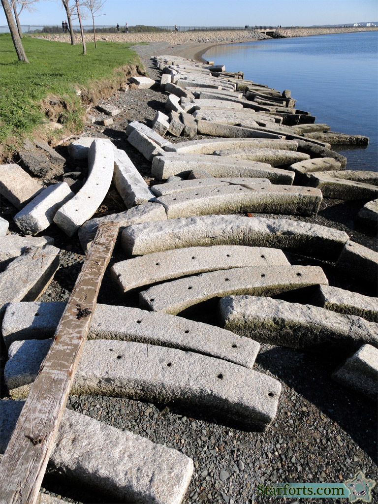 To the south of Castle Island is the Head Island Causeway. This is a sliver of land that is a walkway to teeny Head Island. Along the eastern side of the causeway are these, discarded granite pieces of gun mounts! Were these part of a water battery at some point, or were they carried all the way from the fort?