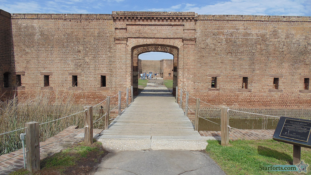 Fort James Jackson's main gate. To the right of the gate squats a plaque that bestows upon the fort status as a NATIONAL HISTORIC LANDMARK, in that it possesses national significance in commemorating the history of the United States of America, so awarded in 2000 by the National Park Service and the US Department of the Interior.