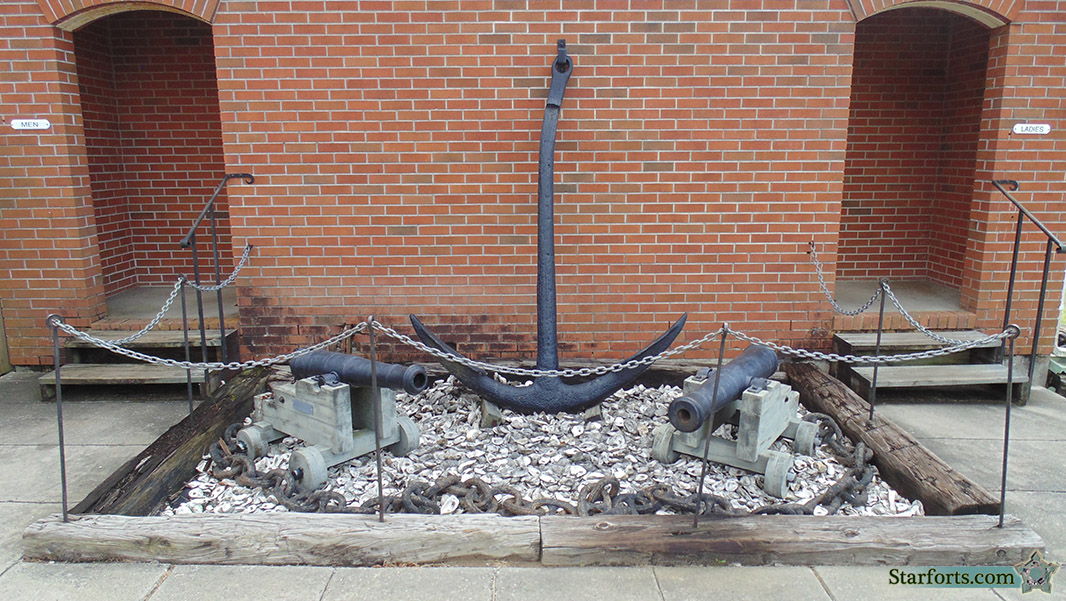 A state-of-the-art restroom facility outside the fort, decorated with ridiculous little signal guns, and what you can