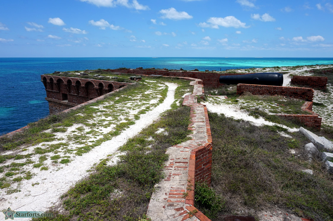 Fort Jefferson's northern bastion. All the other bastions were probably jealous of this bastion, because the fort's huge hot shot furnace is located directly behind the northern bastion, so when all the bastions got together to play cards and drink on Saturday nights the northern bastion was probably insufferable, constantly pointing out how easy it will be for it to get that heated shot immediately, while everyone else will have to wait for fumbling soldiers to juggle those red-hot cannonballs all the way across the fort to all the other bastions.