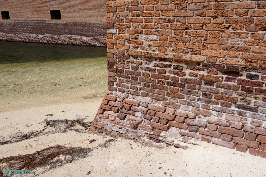 The exposed western side of the southern bastion shows that the bottom few feet of brickwork tilt outward, assumedly for further stabilization? As though sixteen million bricks adhered to one another wouldn't be enough stabilization? Nah, by the time they were building polygonal forts in the mid-19th century, I'm pretty sure they knew what they were doing.