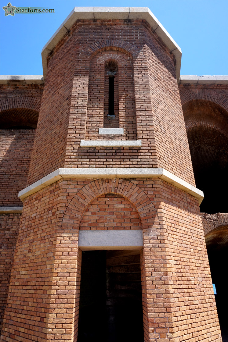 Perhaps it's time to ascend to Fort Jefferson's terreplein via this, the winding staircase at the fort's northern end! As were many American forts built in the mid-19th century, Fort Jefferson was originally conceived as a three-tiered monster...but very few of those three-tier plans ever came to full fruition (Fort Point at San Francisco may have been the only one to make it all the way to three tiers), and as a result there are a series of semi-finished one- and two-tier forts dotting the eastern and Gulf coasts of the United States. In Fort Jefferson's case, once they had built up to two tiers, 'twas revealed a great deal of settling: The fort was essentialy sinking into sandy Garden Key. The engineers were able to solidify the island enough to support two tiers, but a third would have spelled disaster...and so they contented themselves with just the two. |