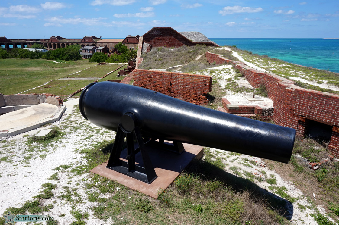 Part of Fort Jefferson's modernization program of the 1870's was the construction of eighteen traverses along the terreplein, or barbette tier. Each of these batteries included two Rodman Guns on pintle mounts, with a traverse magazine betwixt. This concept came about when everybody saw what happened to such American forts as Fort Sumter, Fort Macon and Fort Pulaski during the Civil War: They were pummelled to defeat in short order by rifled cannon, proving the masonry fort to be considerably less impregnable than previously imagined. It was thought that guns atop forts, as opposed to being in those fragile casemates, would be more survivable in the future. Set aside the fact that they're still supported by all those delicate casemates. A nearby sign relating to the traverses: Traverse Magazine. |