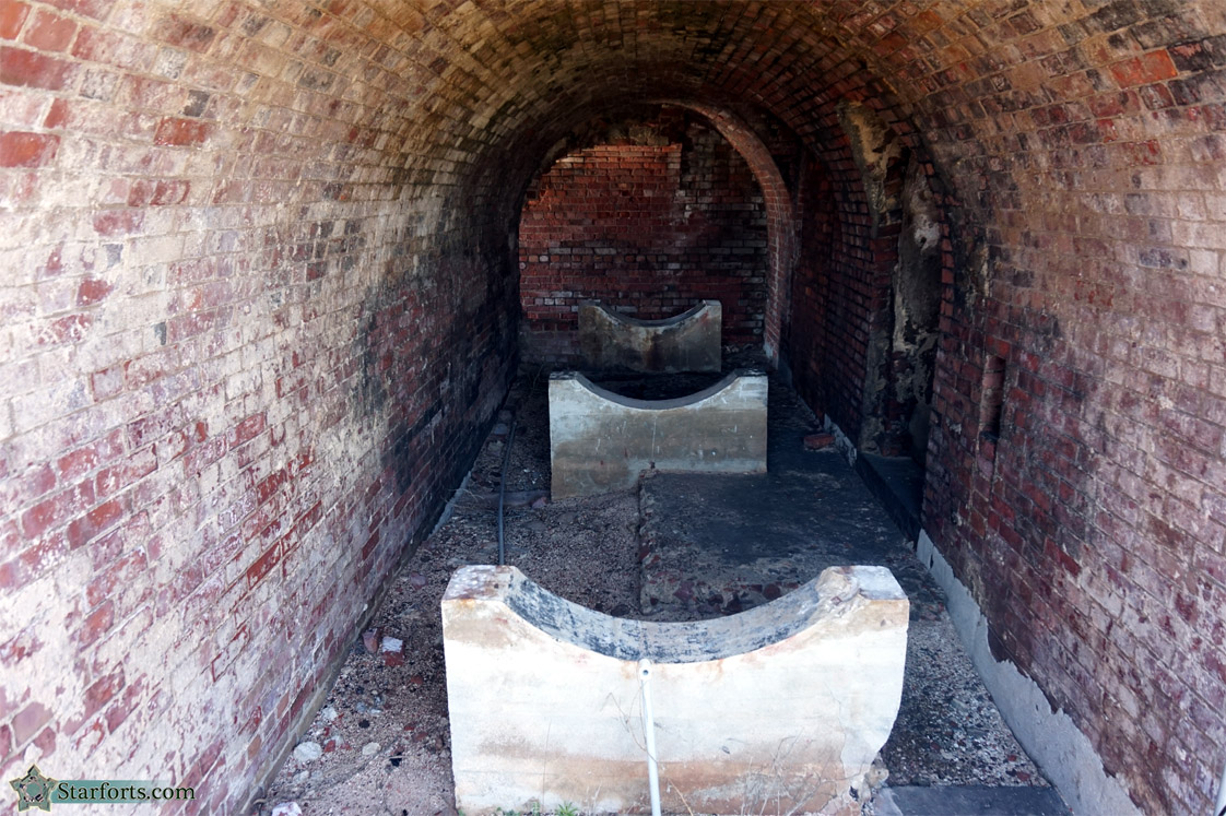I have come across such mysterious supports in other American starforts, which forts weren't initially designed with the expectation of such things as generators for electricity being necessary...and in the signature slapdash style of the end of the 19th century and beginning of the 20th, solid and ugly supports such as these were swiftly constructed. I mean I can't blame anybody, if it were a choice betwixt soon-to-be historical masonry that didn't necessarily serve any present purpose and electricity, I'd go with electricity too.