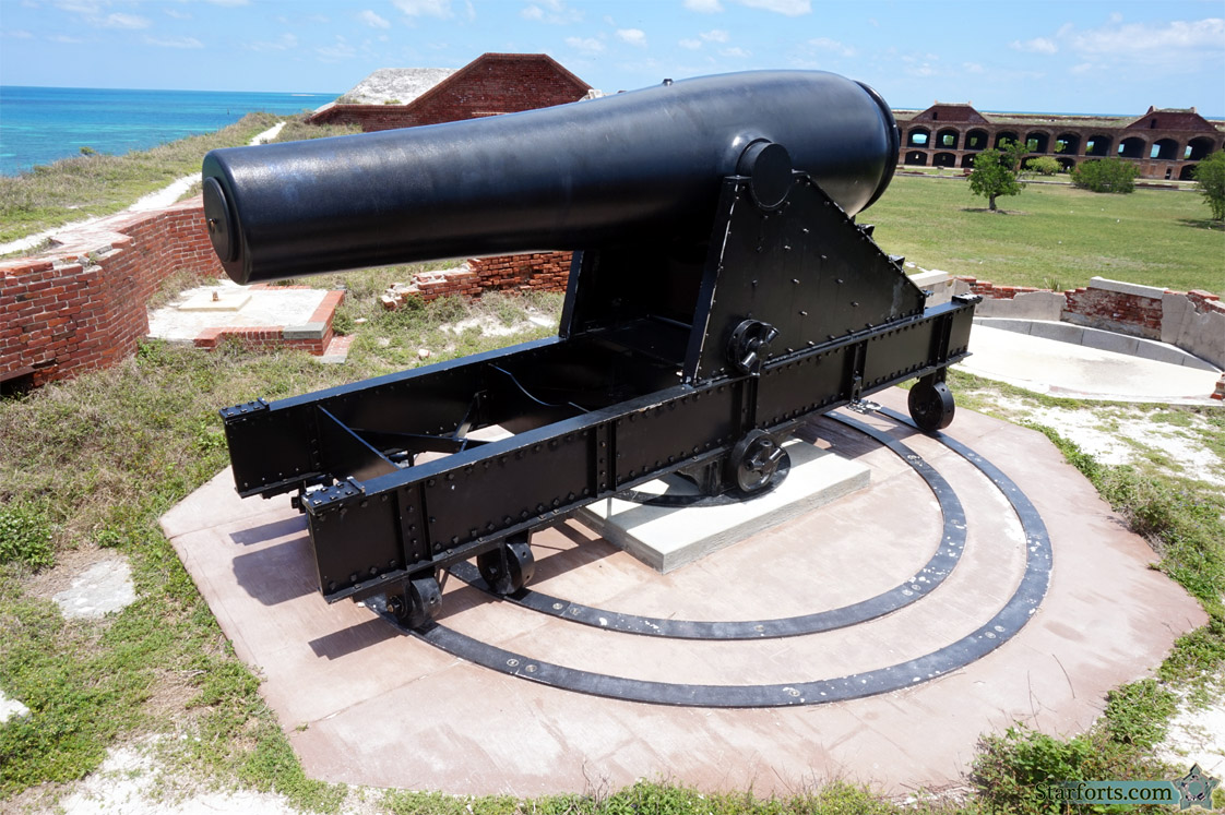 The northwest bastion sports Fort Jefferson's only fully-reproduction-mounted gun, this 15-inch Rodman! Poised to forever defend the fort from the treacherous Loggerhead Key (with its lurking lighthouse) three miles distant, this gun is supported by the sign, 15-Inch Rodman. |