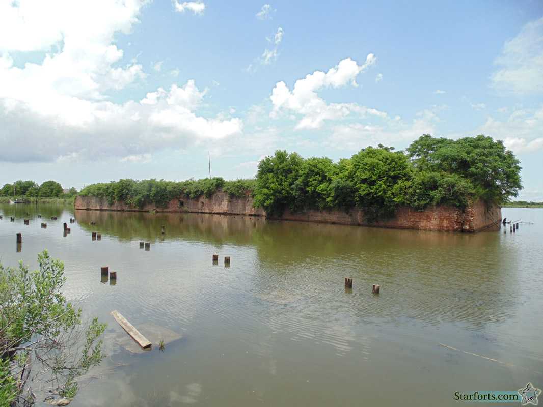 Fort Macomb's southwestern wall, and southern bastion. Please note how far out from the top of the bastion the vegetation is reaching. This will come up again later. Yes, there