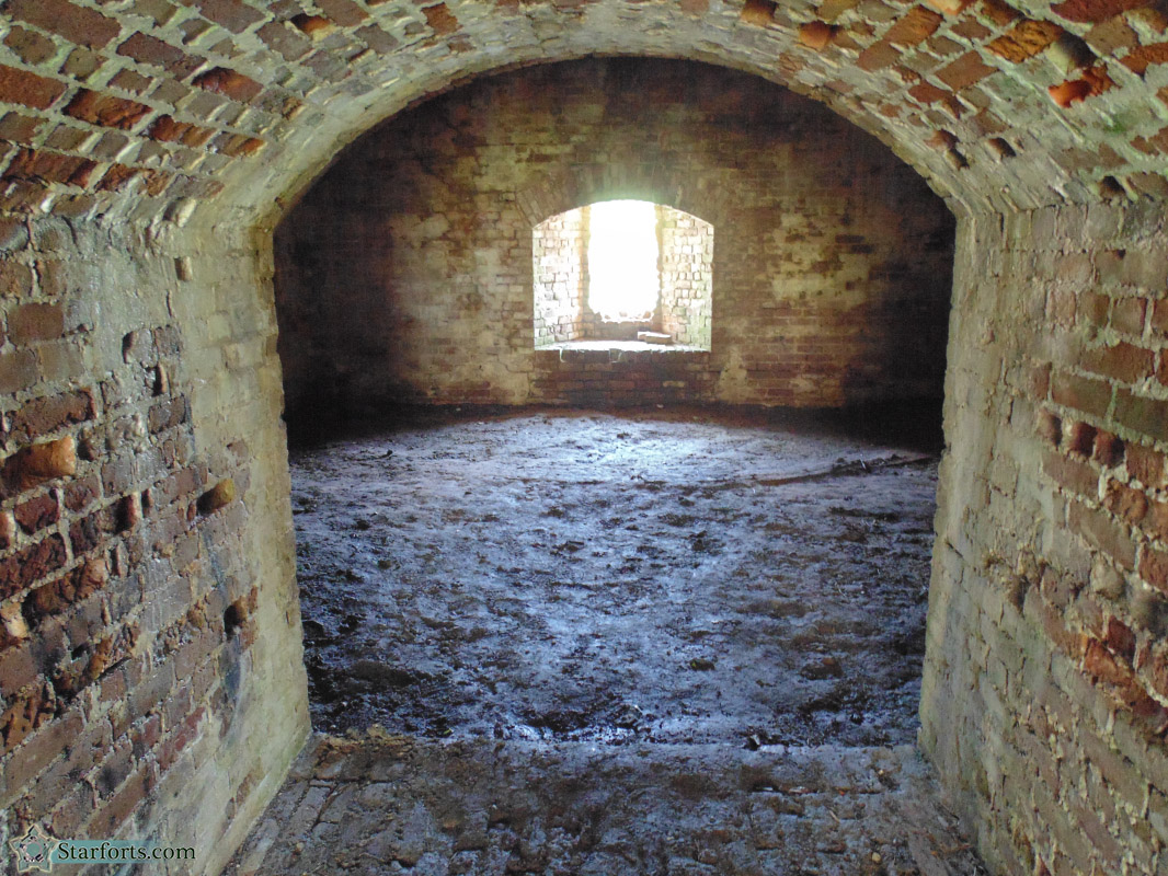 I believe I've already made the muddiness of the casemates pretty clear. Note the bricks at the edge of the tunnel walls leading into the casemate, however: In several instances, individual bricks have deteriorated away, leaving the mortar in place. This was something I noticed at a few forts during this trip along the Gulf Coast, that I had never experienced at northern starforts.