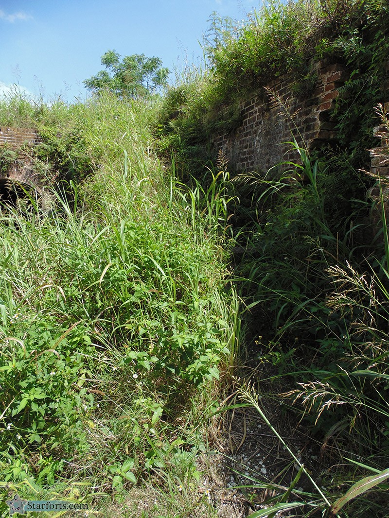 All right! We are done with Fort Macomb's ground level, and we are moving up to the second floor, by way of this clearly delineated stairway. See it there? Of course you do. It's the thing with grass on it.