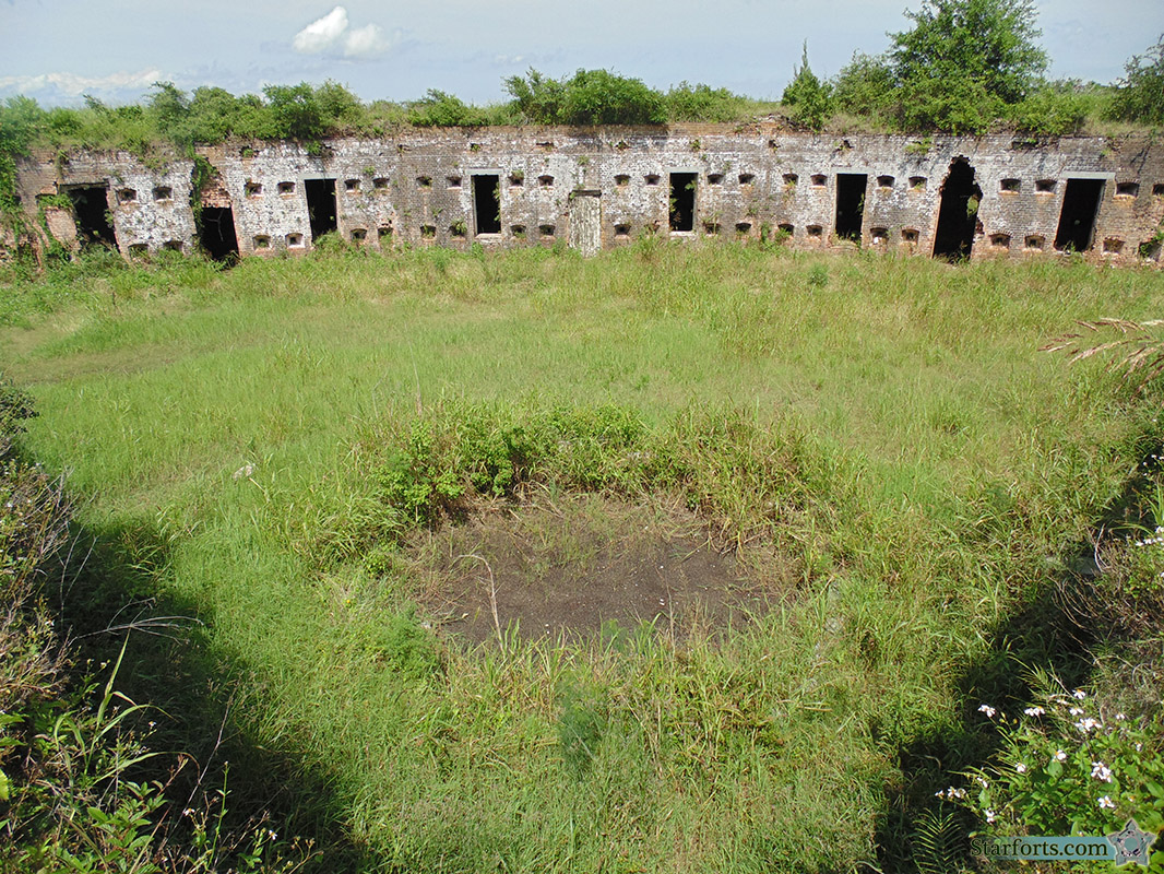 With one's back to Fort Macomb's western bastion and looking o'er the Parade Ground, the location of the fort's well is quite evident. It was clearly filled in before somebody fell into it to their well-deserved death, but with what was it filled in? Some sort of radioactive waste? Why is the local flora so hesitant to reclaim that spot?