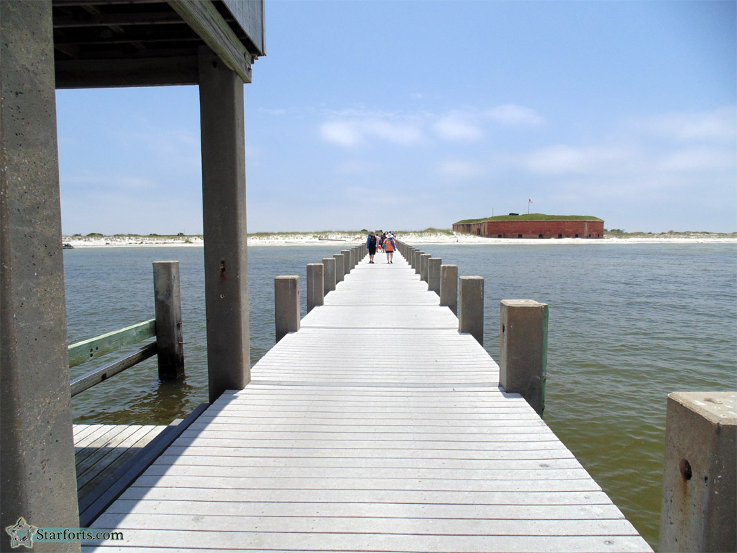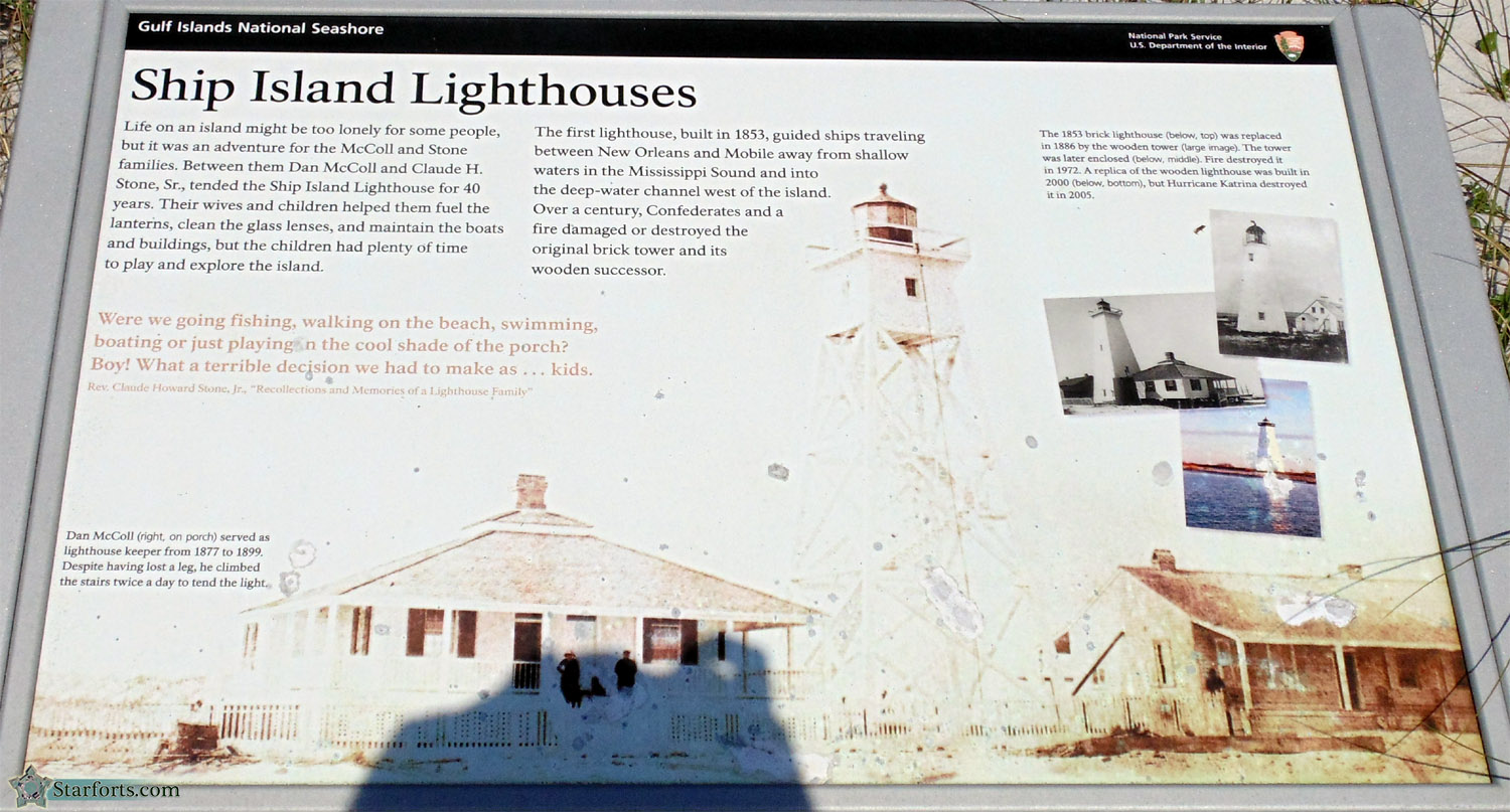Arrival! There were many and varied forms of marine life swooping about beneath our feet on the dock. I saw a ray of some sort come and go before I could get my camera on it! Just to the left ahead on the island is a sign about Ship Island Lighthouses. Lighthouses are cool, but not as cool as starforts, a truism that my dear departed sister bestowed upon me. |