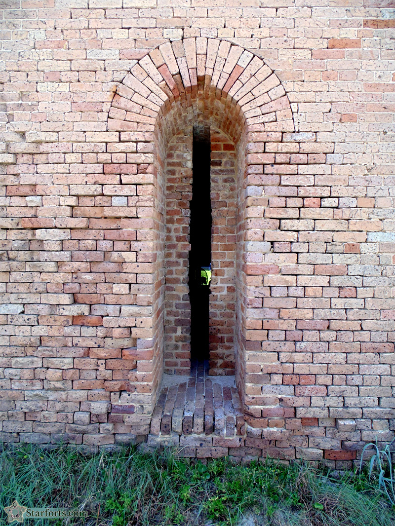 The portals through which Fort Massachusetts' defenders might fire take the form of cannon embrasures around the sides and rear of the fort, but there are four of these firing slits for rifles arrayed along the front, two on either side of the gate.