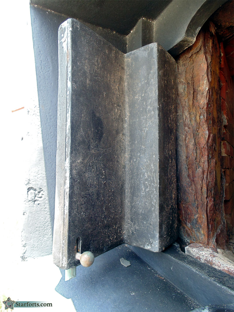 Each swinging door had a lock like this one at the bottom, which kept it shut until the gun crew was ready to fire. These spring-loaded latches were undone and the gun was fired at the closed doors. The heavy doors were balanced so precisely that the gases emanating from the gun barrel ahead of the projectile pushed the doors open, and then they swung back shut and relatched themselves as the crew reloaded, safe from return fire.