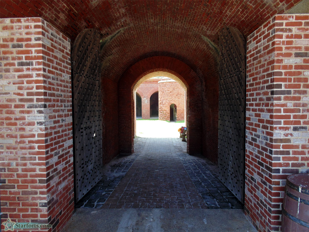 No big surprises with the entryway: A stout wooden door ahead of a stout arched portal, with lovely brickwork.