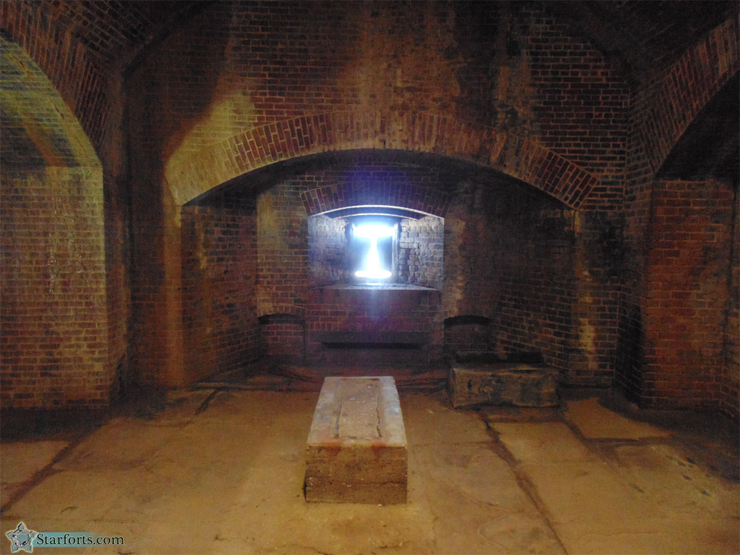 A grimy firing embrasure in a casemate, complete with shutters! I've recently learned that the raised, concrete rectangles such as we see in this casemate were built as bases for generators and other equipment at the end of the 19th century in many American forts. They are known in modern parlance as "housekeeping pads," but the Endicott Period US Army probably had a much cooler name for them.