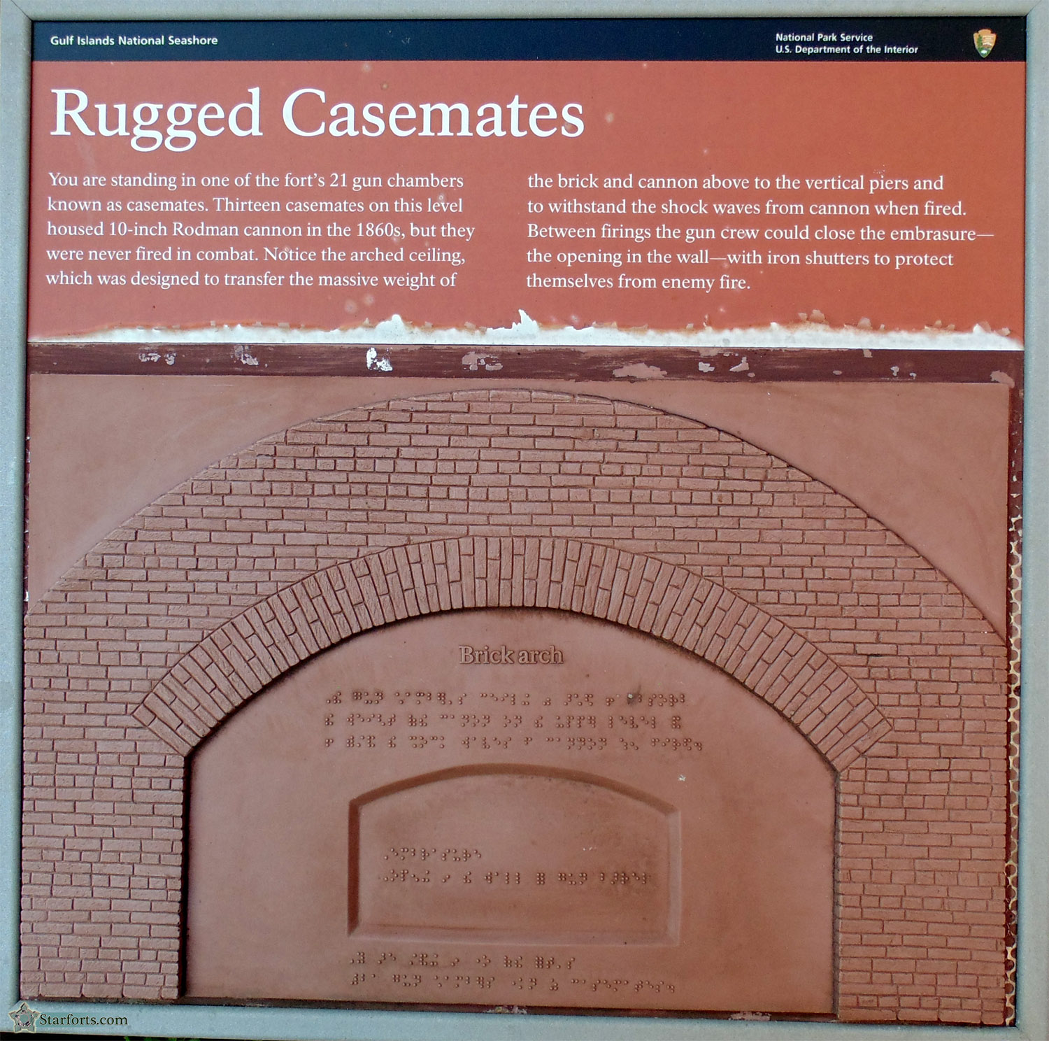 I promise that I took many pictures of that hot shot furnace, but let us turn instead to the lovely, placid parade ground of Fort Massachusetts. The arresting feature of the fort's interior is of course the beautiful spiral staircase, the utilization of which transports one to the terreplein. The sign visible in the distance describes Rugged Casemates. |