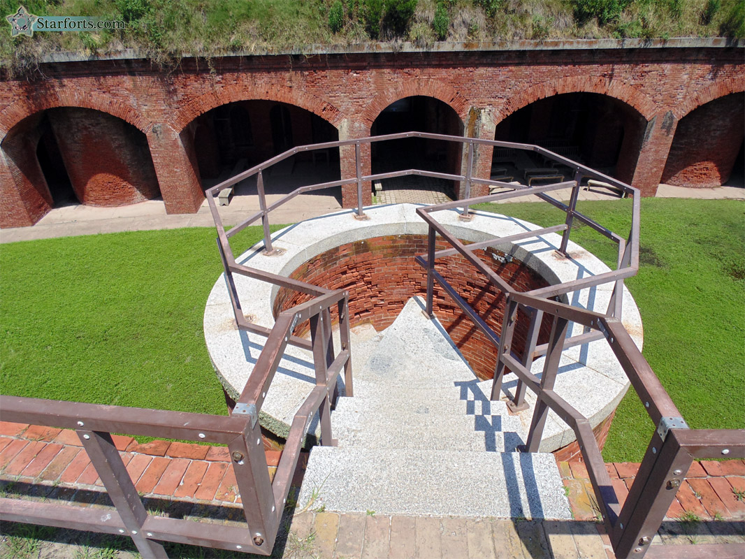 We've arrived, and to prove it, we're here! The safety railings are of course a modern addition: As signs at American starforts today frequently warn, "this fort was built for war, not for safety." Any luckless soldier who plunged from the terreplein to the parade ground would be screamed at by his sergeant for his stupidity, and for the blood with which he was soiling the clean fort.