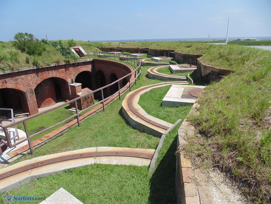 The circular loops of rusty iron on the ground are of course gun mounts. Fort Massachusetts has ten of them along the top of its curved, western-facing wall, while only four face to the east, but two of