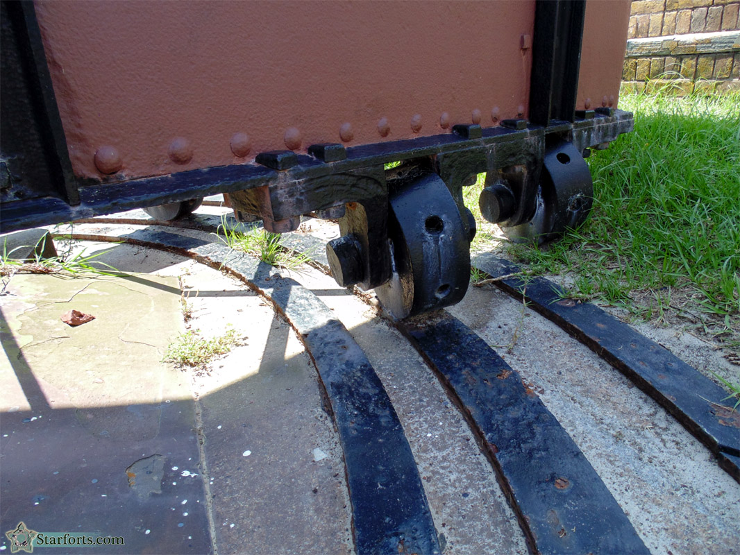 We seldom pay much attention to a gun carriage's relationship with its mount...so here ya go! Smaller iron wheels rotate directly around the mount's pintle in the center, and larger wheels roll along the flat iron bands further out...at least they should do so, looks like there's one wheel too many off the rails! Does that mean this is the improper carriage for this mount, or did they just not care about that furthest wheel out there? I do not pretend to be any sort of artillery expert, I only pretend to be a starfort expert.