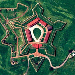 A dry moat had originally surrounded the fort, from whence foot soldiers would fire upon an attacking enemy as the big guns would pound from o'erhead. 200 years of weather, settling and whatnot have brought the ground around the fort up, making the walls seem oddly stumpy...but back when the British were threatening, assured my friend the Ranger, the walls were daunting indeed.