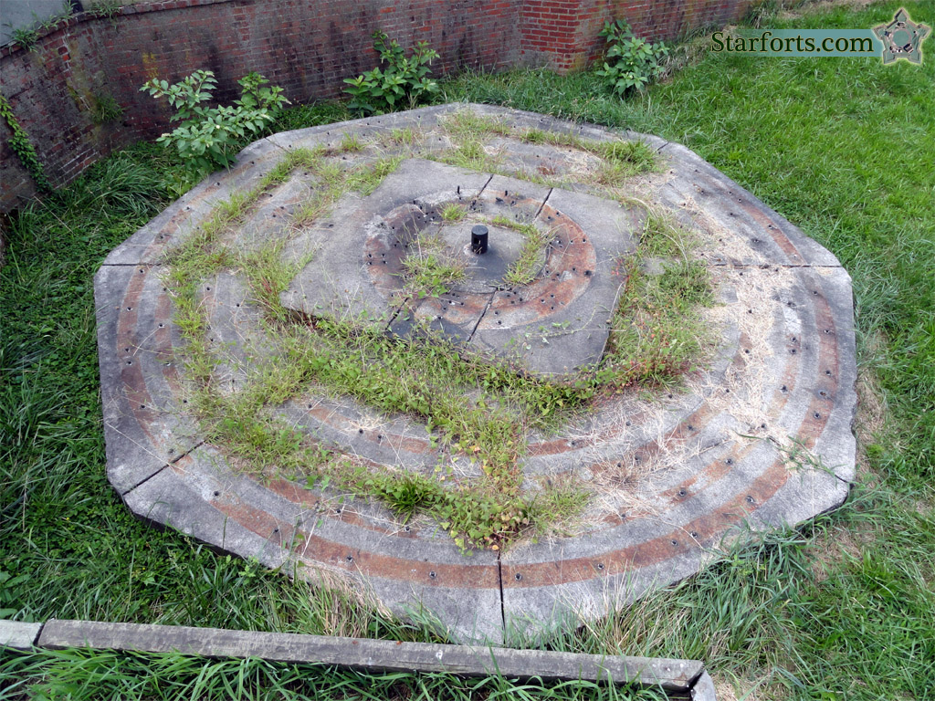 Pintle! Today there are three such pintles still in evidence at Fort Mifflin, upon which a 15" Rodman Gun was likely mounted, in the three southernmost bastions: These would have been the ones most likely to be facing riverborne enemies.