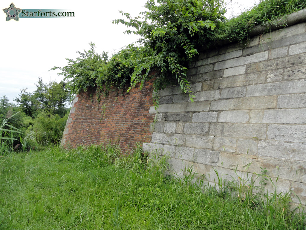 We come now to Fort Mifflin's river-facing side, in this case the southwest. Noting the sudden difference in building materials, I came up with the brilliant theory that, on the sides of the fort most likely to be fired upon by naval artillery, granite was used; while for the rest of the fort, it was more inexpensive brick. I came to this logical conclusion because I hadn't bothered to read any of Fort Mifflin's many informational signs, which made it clear that the riverward side of the fort was the original, 1772 construction (granite), while the rest of the wall wasn't completed until after 1778, with brick.