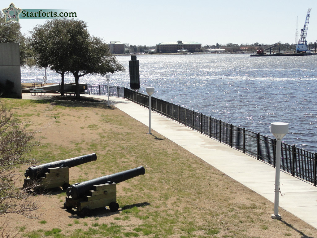 A couple of adorable naval guns in a picturesque spot that they likely would not have occupied. In that they're just sitting there, unprotected, while there's a perfectly nice white fort sitting right next to them.