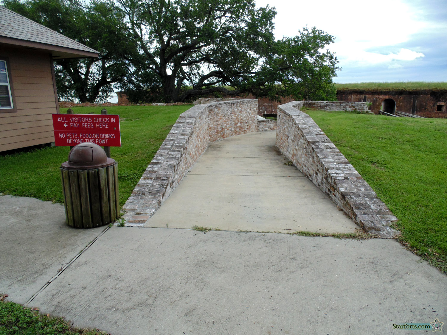 Fort Pike is surrounded by masonry walls on its landward side...these weren't so much walls intended to keep out a foe, but rather to act as an outer defensive position. These walls are in pretty sad shape today, but this, the covered way, has been kept most tidy and impressive. To the left is the lil' Ranger Station...and perhaps that red sign explains why there was no litter in Fort Pike at the time of my visit: No pets, food or drink beyond this point! Discarded beverage bottles and/or cups are by far the number one form of detritus that I've seen in my starfort travels.