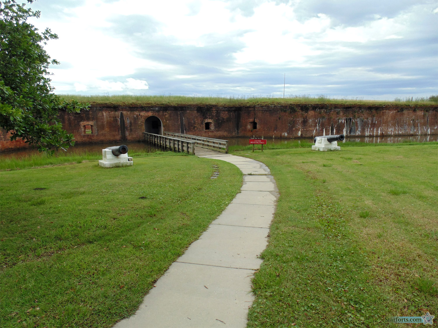 Unusually for an American moated starfort, Fort Pike's moat is in great shape, and would still effectively deny access, were it not for the handy walkway we see before us. When operational, this entrance was covered by a pair of 24-pounder flank howitzers in the north and west bastions, and had a drawbridge.