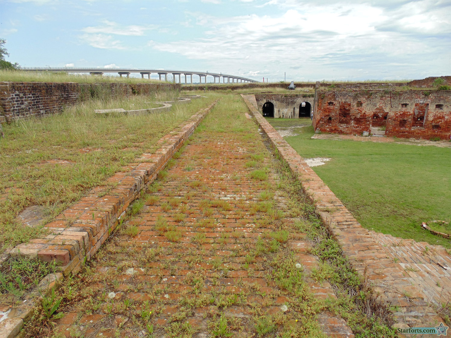 The nicely-bricked surface atop which guns would have been wheeled from place to place, along Fort Pike's northwest wall.