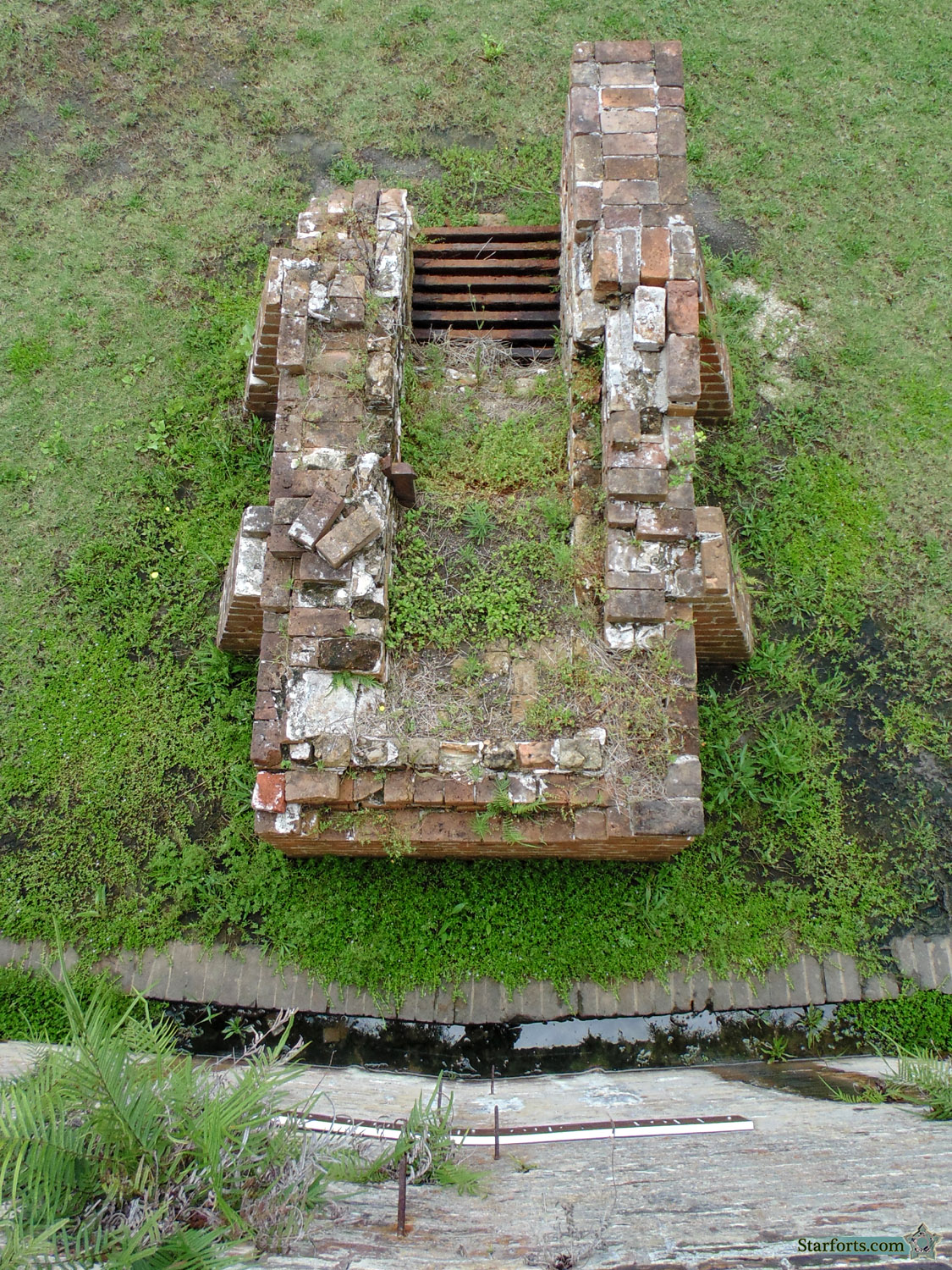 Looking straight down at the one of Fort Pike's two shot furnaces that is at least recognizable as a shot furnace (they're both along the rear of the fort's eastern-facing, curved wall, and this is the southernmost of the two), it seems pretty clear that this was little more than a grill, atop which cannonballs would be placed until they were red-hot and ready for action.