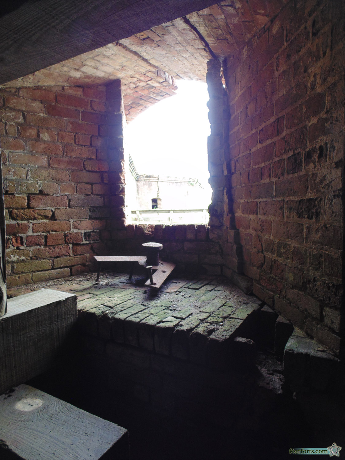 With just a wee bit of squirming we reach the most photogenic spot of many a starfort, which are the embrasures for the guns that covered its flanks. In Fort Pike's case they were 24-pounder flank howitzers, connected to the embrasure via the iron pintle we see here. Click the link for a better look at that rusty ole iron!