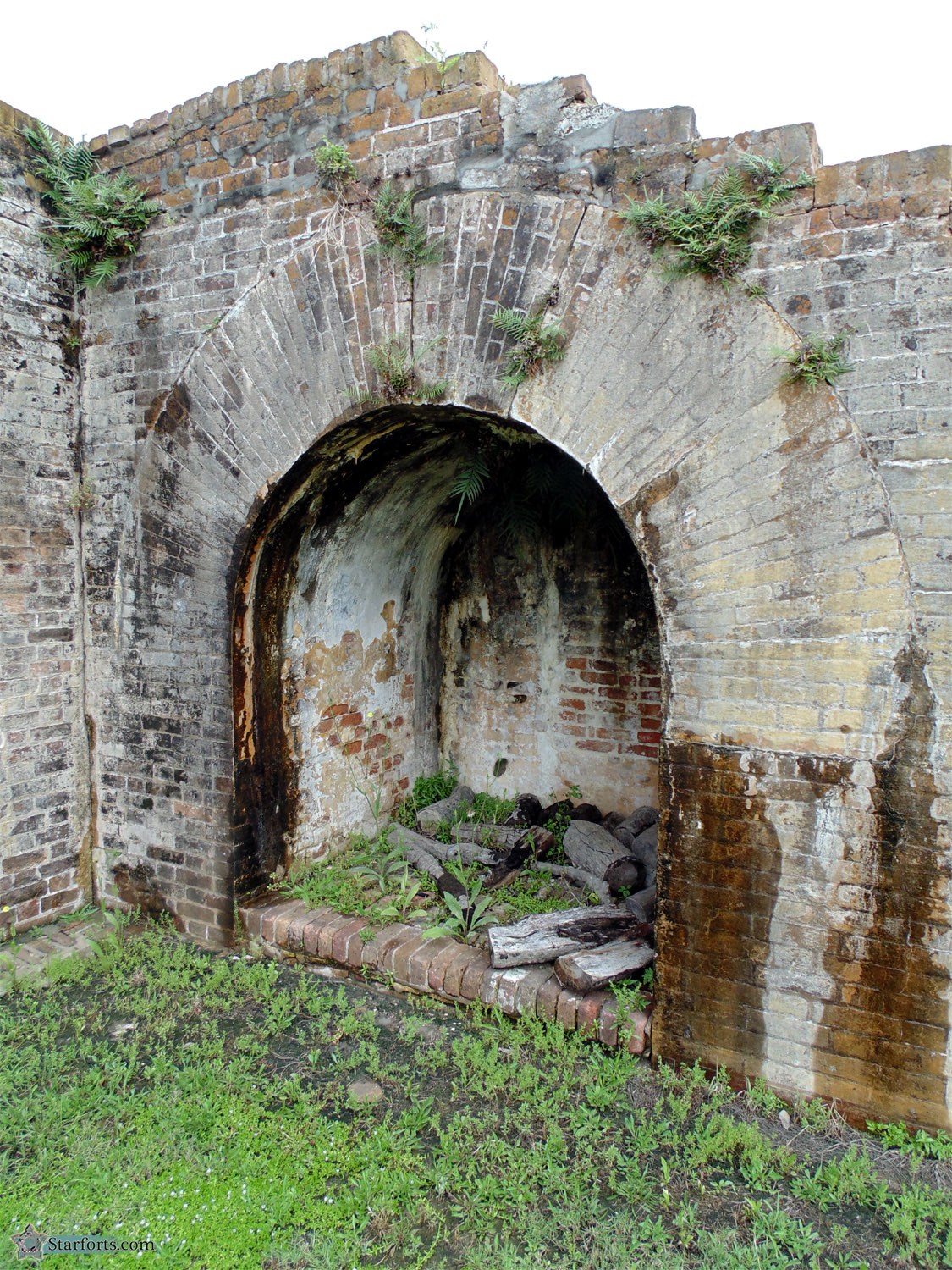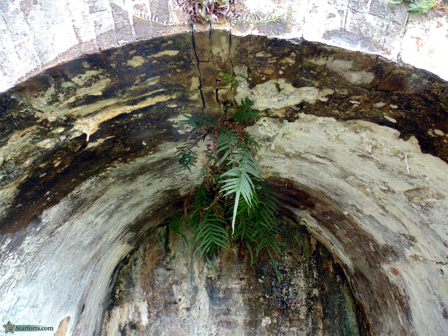 A handy storage alcove under the steps to the terreplein, along Fort Pike's southern wall. Has someone been using it as a fireplace within the past twenty years or so? I sure hope not. Maybe what I'm taking for soot along the back and top of this alcove is just more creative moss and other associated goo. If you'd like a better angle on the ferns that are hanging from the top of this alcove, click here!