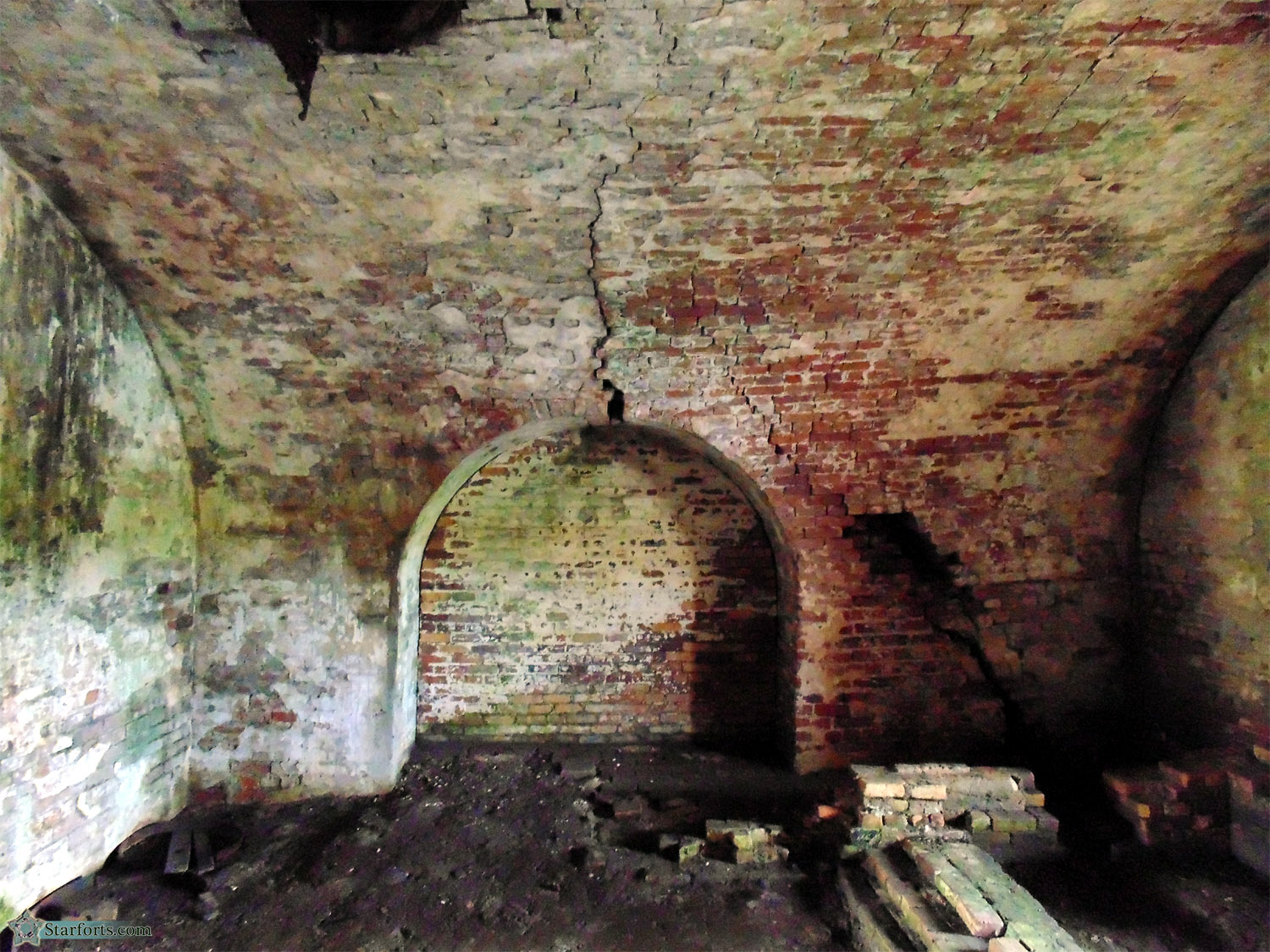 See? What did I tell you? This is in the same casemate with what I surmised may have been what was left of a supporting structure for a water condenser, however, and what do we see directly before us? Well, frightening cracks of course, but also a bricked-in alcove, which probably led to the next casemate when Fort Pike was originally built. What I don't know is precisely when this bricking-in-and-water-condenser-installation occurred...but it was prior to the Civil War, so we can probably thank slaves for those bricks. In fact we can thank slaves for a lot of Fort Pike's construction!