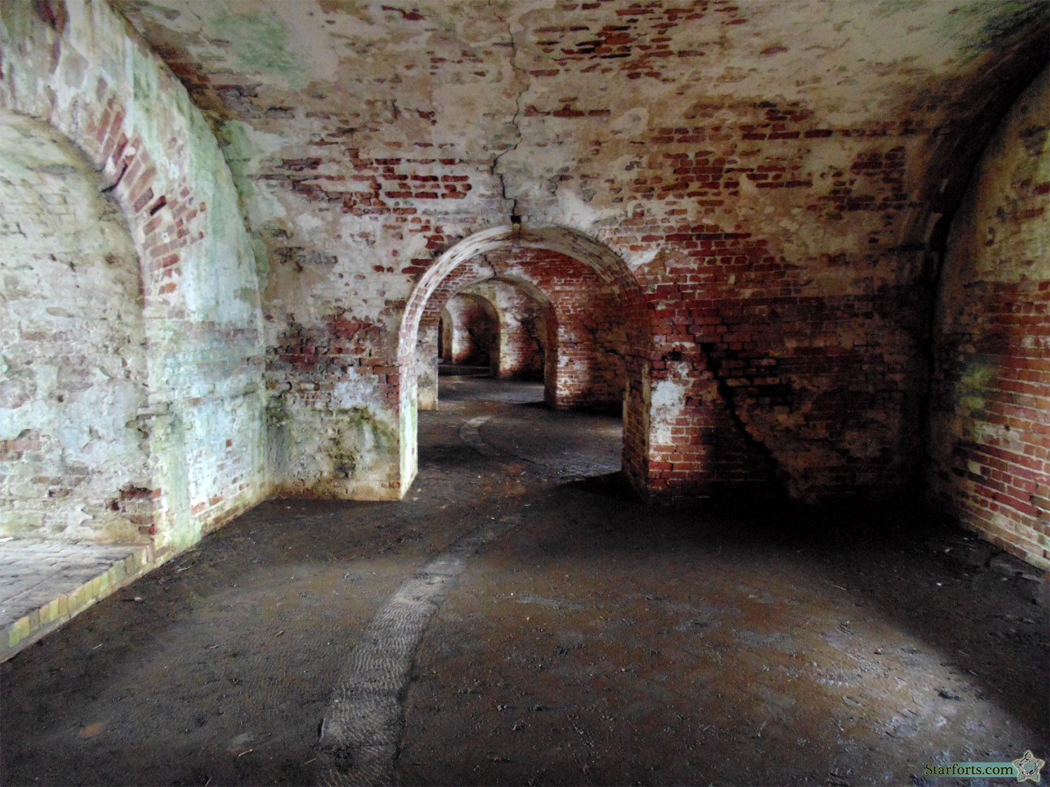 We of course are accustomed to seeing long rows of casemates diminishing off into the distance, but what's pretty rare amongst American starforts is this curve we get along Fort Pike's eastern side, which side faces the direction from which trouble was expected to approach: The Rigolets. In theory, this was to give the twelve guns covering the waterway the widest angles possible, and it was definitely Simon Bernard's idea.