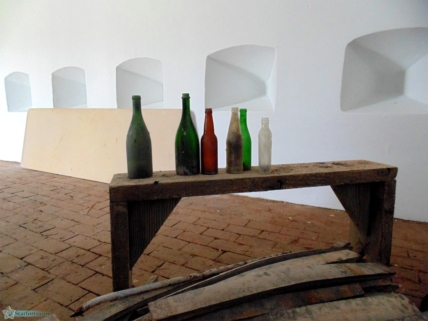 Hang on, here's an historical display! Of some olde tyme bottles, olde tyme bench and yet more evidence of barrels. Nice of them to leave the rifle ports evident, if not useable for their intended purpose. It was nice and cool in this room, on an otherwise pretty darned warm day.