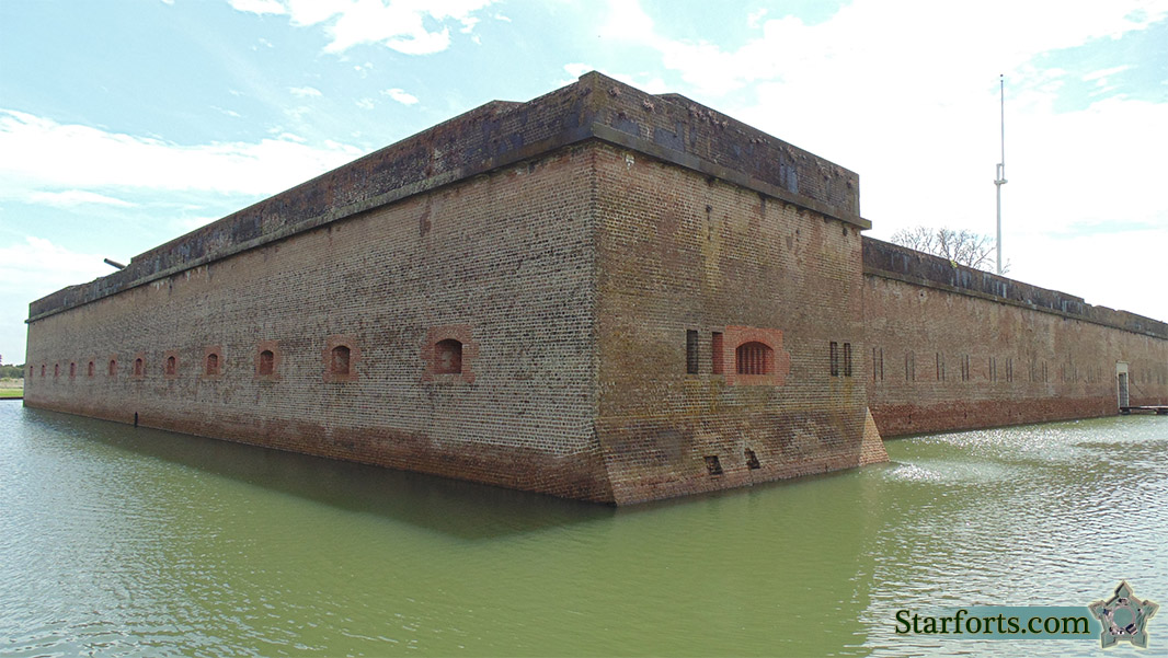 Fort Pulaski's northwest bastion. Starfort corner? perhaps not, but that most definitely is a bastion. Fort Pulaski is unusual in that it was constructed exactly horizontally along an east-west axis, which was a thoughtful tip of the hat to those of us who would be admiring it from the vantage point of satellites 180 years later. |
