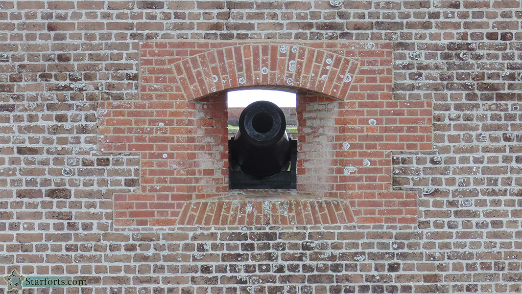 Peek! A gun in a casemate, just waiting for some target to conveniently present itself. Guns in casemates never had much of what one might call a wide field of fire, instead depending on things floating slowly before them...and as far as I can tell, the casemated guns of America's starforts were hardly ever employed in their intended fashion. The wide-open terreplein, or a fort's upper gun deck, proved a much more practical location from which to utilize cannon.