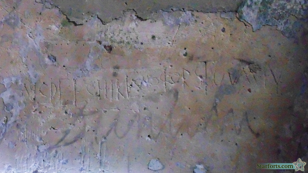 There is a panoply of 300-year-old grafitti along the walls of many of the Castillo's casemates. The conscripted soldiers of the mighty Spanish Empire, billions of miles from home and bored out of their minds, found little to do when not on duty once the batteries in their iPhones gave out. Several depictions of ships, which were these soldiers' lifeline to home, and various semi-coherent scribblings are carefully protected and documented with informational plaques. What we're looking at here is likely the work of a soldier who was learning to read and write.